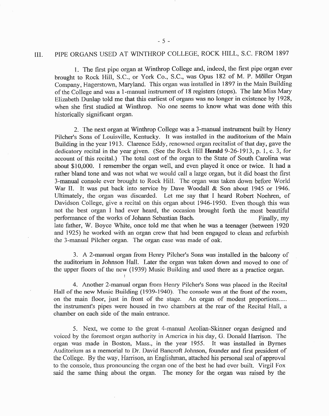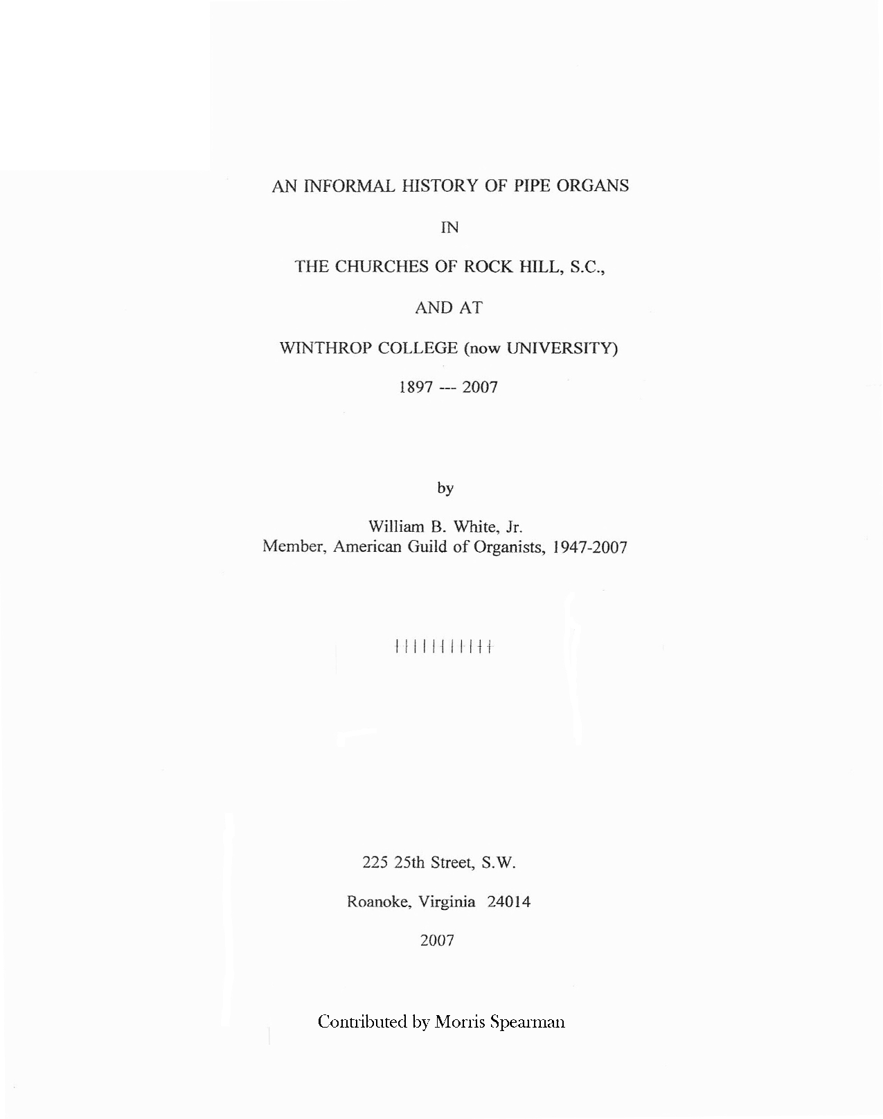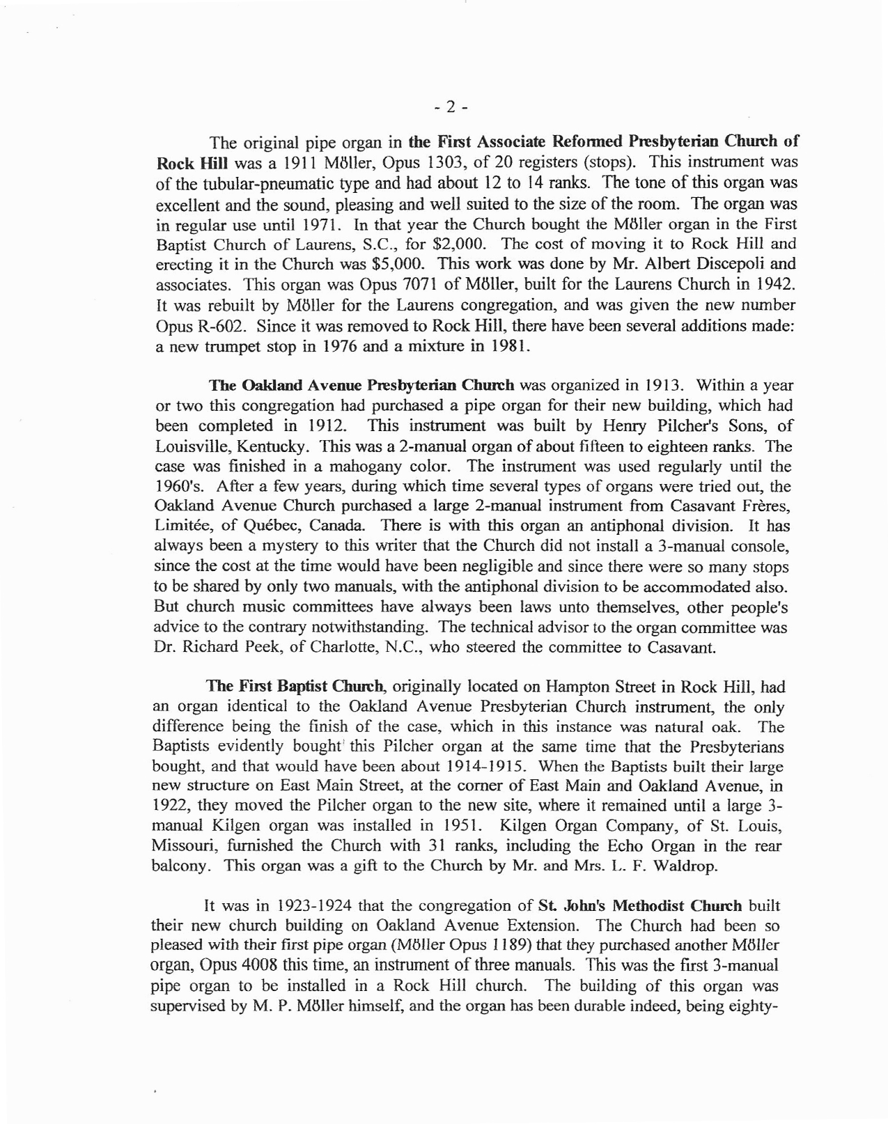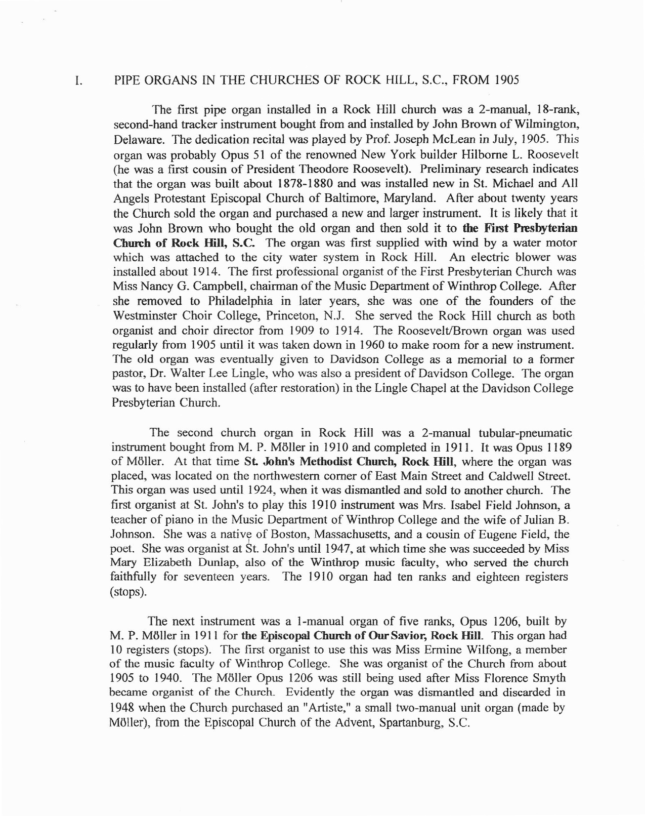 An Informal History of Pipe Organs in the Churches of Rock Hill, SC, and at Winthrop College (now University) was written