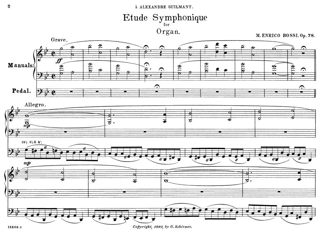 Opus 78, with its 805 pedal notes, became one of Bossi’s most popular pieces. Notable early performances included those of Edwin