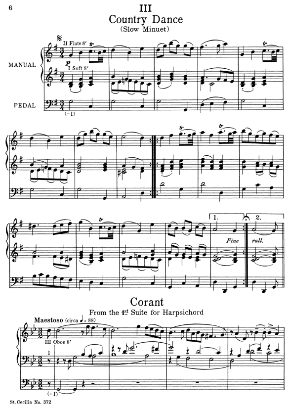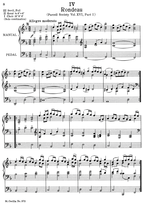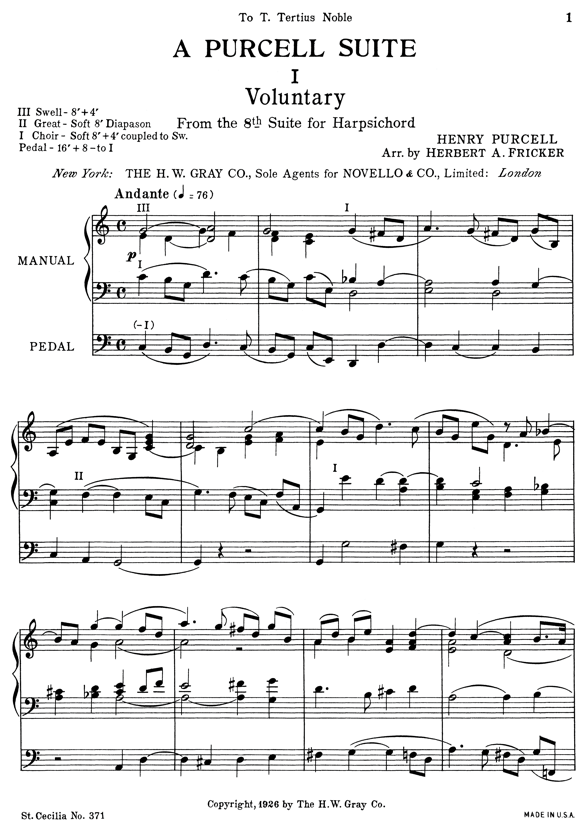 Herbert Austin Fricker (1868-1943) was born in England, studied with Frederick Bridge and Edwin H Lemare, and served as city organist for Leeds. In 1917, he emigrated to Canada and was an active recitalist in Canada and the United States. A Purcell Suite is his collection of some of Purcell’s best known tunes from several sources arranged into a suite for organ. Perhaps the most widely recognized tune today is Movement IV, Rondeau, which is the basis for Britten’s “The Young Person’s Guide to the Orchestra,” which was subtitled, “Variations and Fugue on a Theme of Purcell.” Moderate.